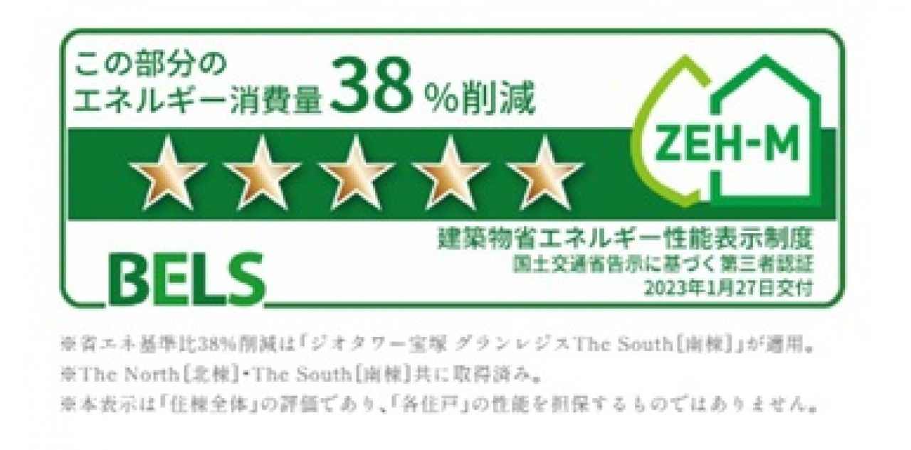 「ジオタワー宝塚 グランレジス」は、断熱性能の大幅な向上と高効率設備により、快適な室内環境を保ちつつ大幅な省エネを実現(省エネ基準比30%削減※1)。「BELS※2」による第三者認証、最高ランクの☆5を取得しています。